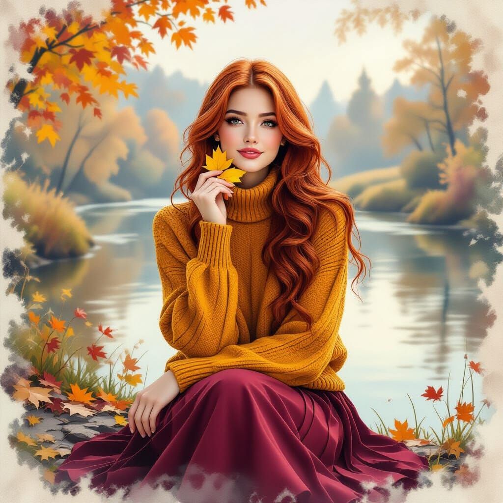 A hyperdetailed, misty watercolor painting of a young woman with red hair on an autumn riverbank. She wears a yellow leaf, bathed in mother-of-pearl and ocher tones.