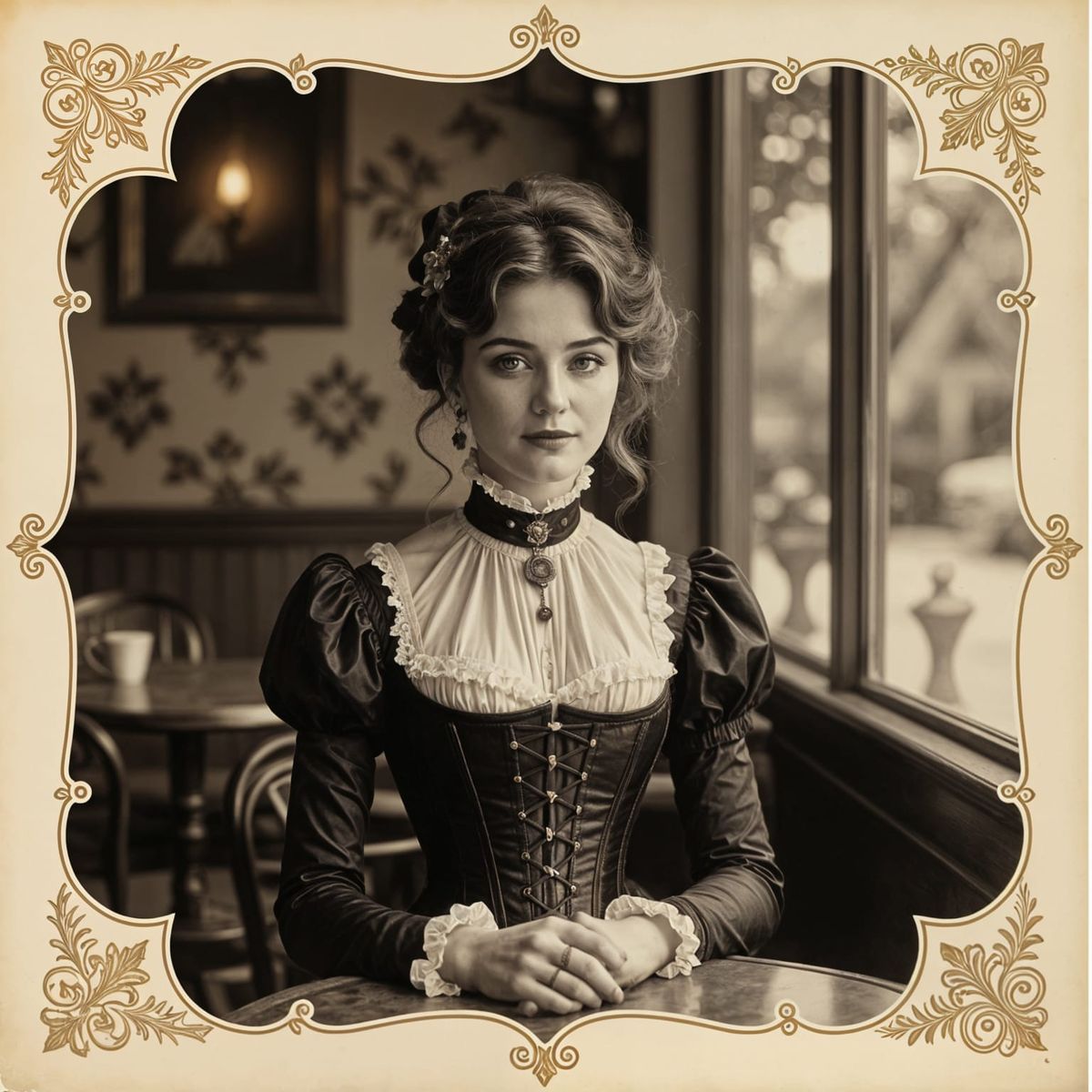 This image shows a vintage, sepia-toned photograph of a woman in a Victorian corset at a cafe in an oasis. The photograph has a creamy texture and floral patterns.