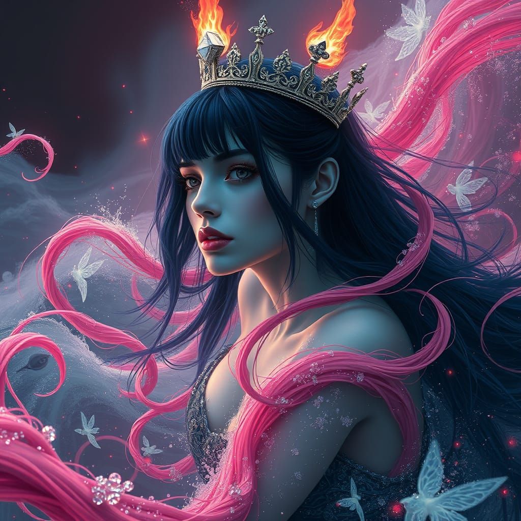 Gorgeous cyberpunk siren princess with long dark indigo hair and burning diamond crown, swimming in the wild, stormy red ocean full of fairy pink hair and butterflies, supernaturally lit in her ethereal beauty.