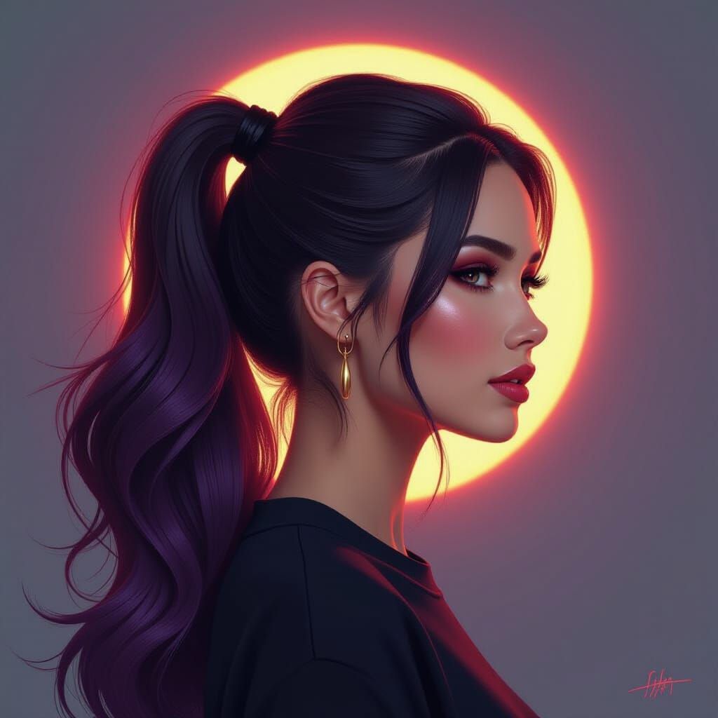 A striking digital painting of a woman with a high ponytail that transforms into a solar eclipse. Features ethereal glowing hair in deep purples, blacks, and orange with cinematic lighting.