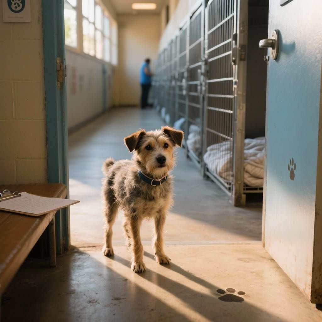 This photorealistic image captures a mixed-breed dog leaving a shelter, looking back at empty cages. Warm light and a low camera angle create an emotional, authentic scene of a new beginning.