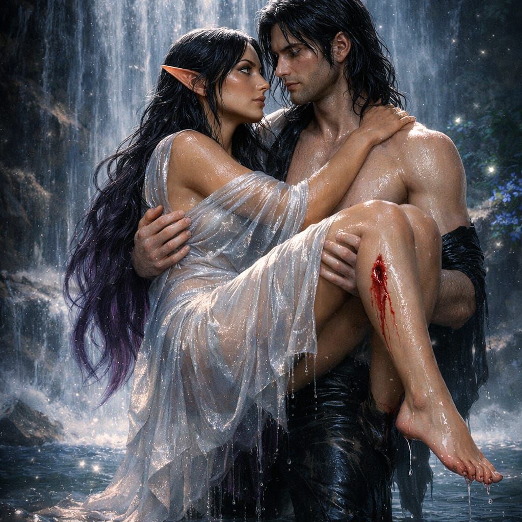 This digital art depicts an elven woman with black and purple hair emerging from a waterfall, supported by a man in leather. Features ethereal, jewel-toned lighting and a high fantasy atmosphere.