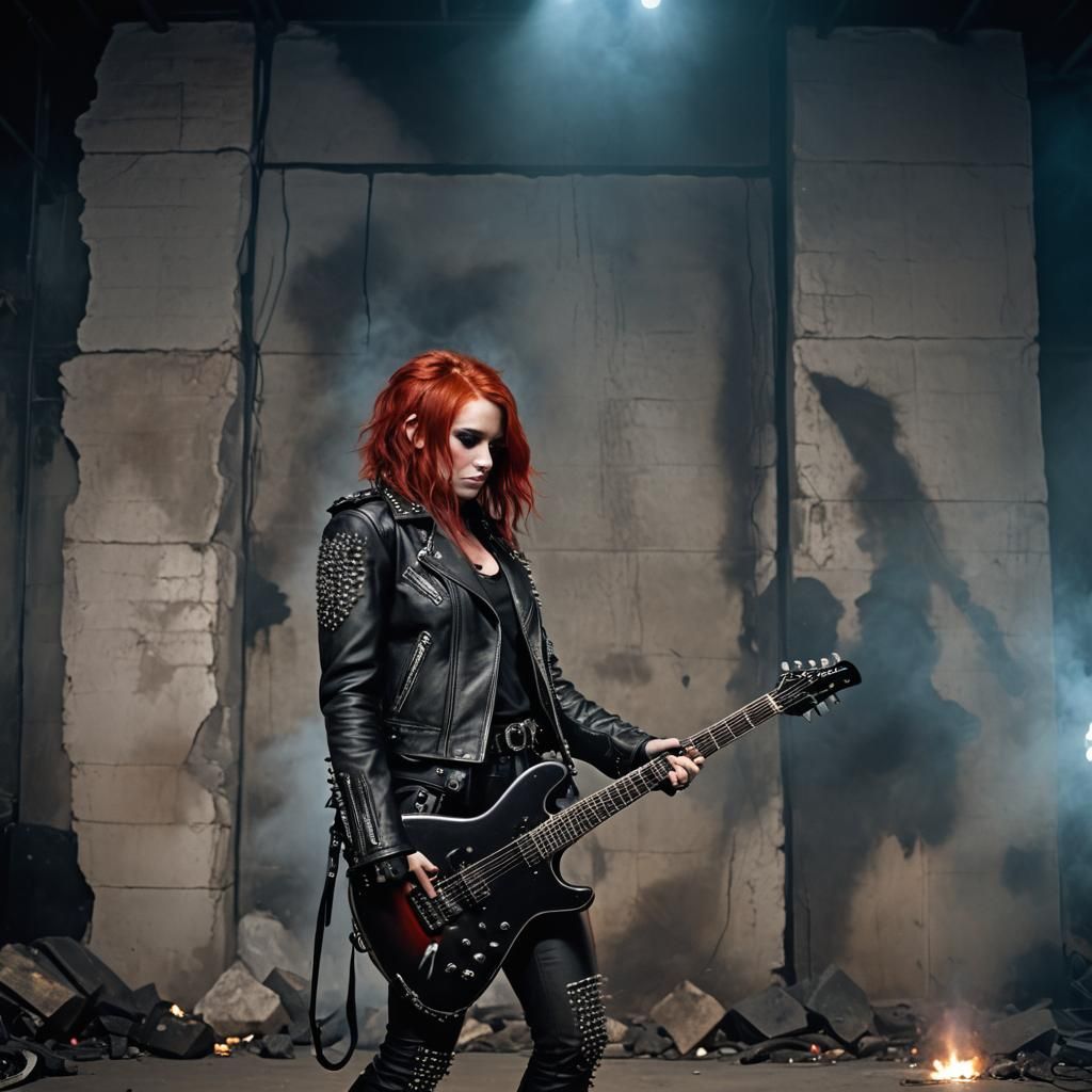 A striking picture of a female rocker with fiery red hair playing an electric guitar. She is clad in studded leather clothing in a dark, smoky venue with a gothic, high-energy aesthetic.