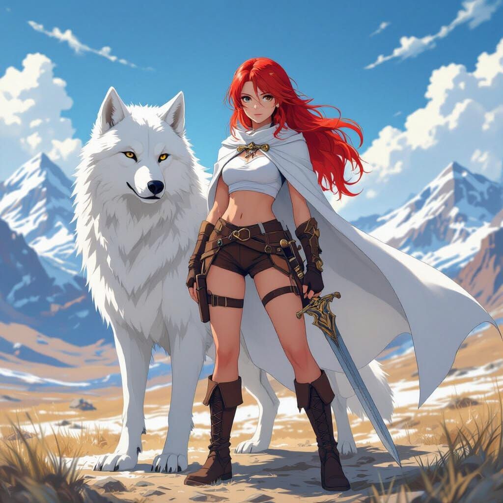 This image shows a red-haired warrior girl and large white wolf standing together in a fantasy landscape. The scene is rendered in a vibrant anime style with dynamic lighting.