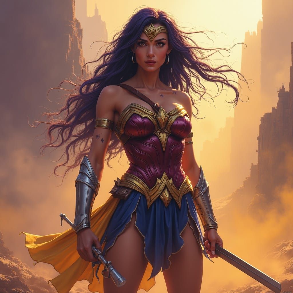 A powerful Amazonian warrior in iconic attire stands in a futuristic, dust-filled wasteland. The scene features dynamic lighting and a striking purple and yellow color palette, rendered in a dark fantasy concept art style.