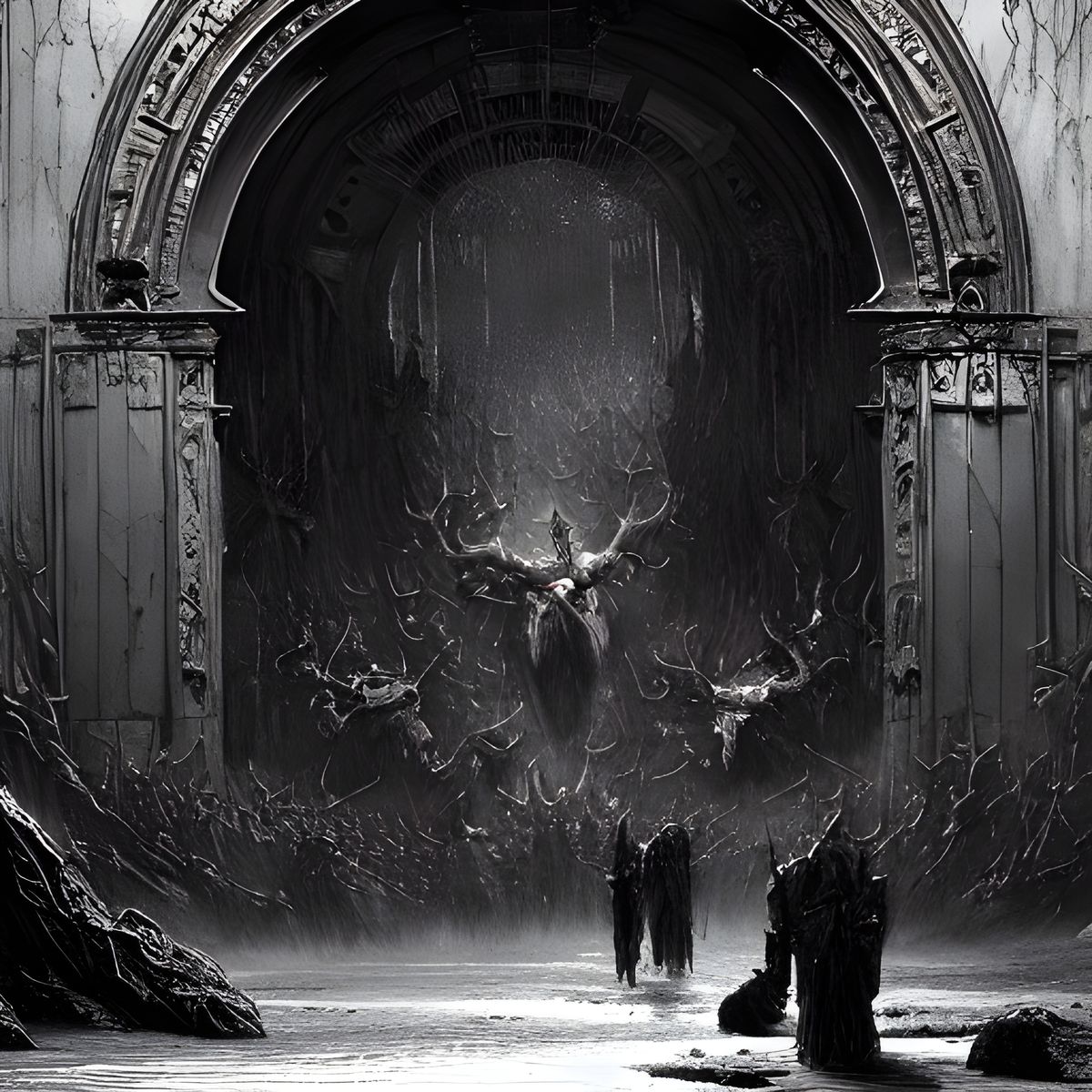 A horrifying vision of the Gates of Hell. This image depicts a highly detailed and dramatic scene, rendered in a style reminiscent of dark engravings.