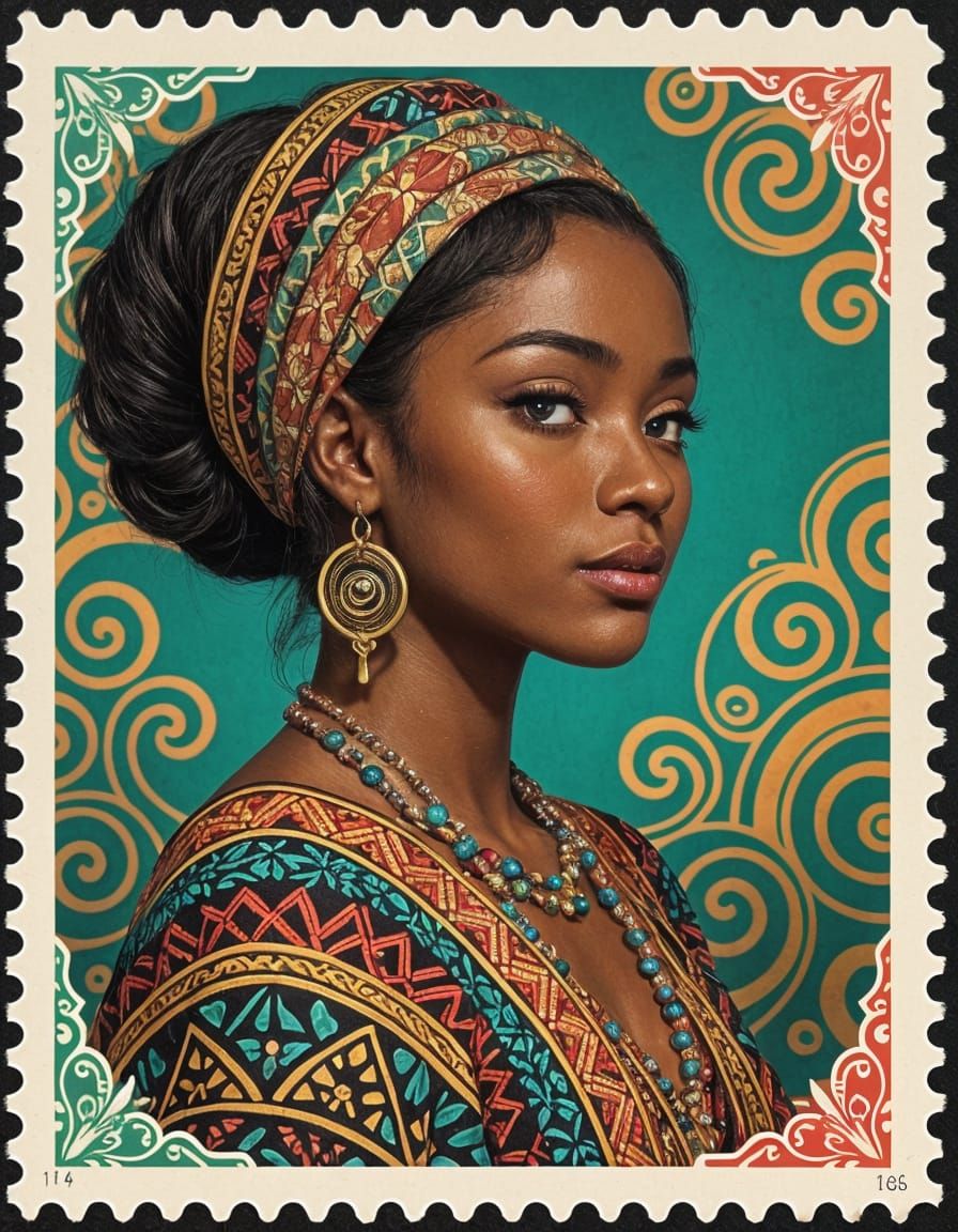 A hyperrealistic anime-style illustration of a beautiful Black woman depicted on an old postage stamp. The artwork features intricate details, dramatic lighting, and a colorful background.