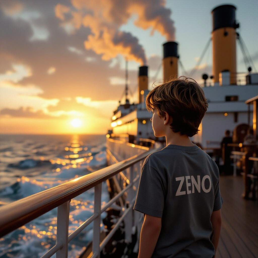 A realistic portrayal of a young boy with brown hair on the Titanic's deck, wearing a shirt that says "ZENO". Smokestacks loom behind him, dramatically lit by the setting sun over rough seas.