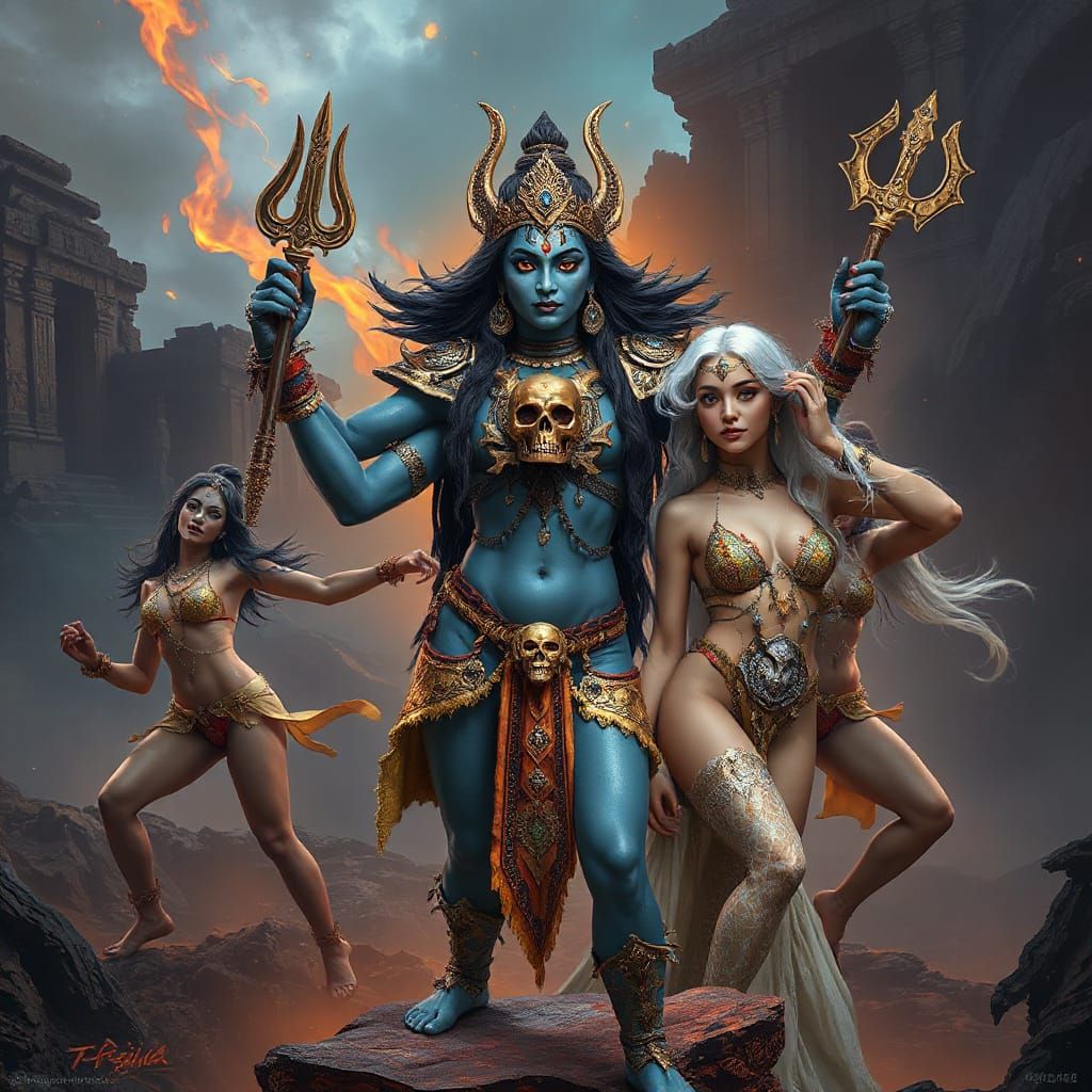 A photorealistic image of the Hindu goddess Kali surrounded by dakinis and a lamia warrior in a volcanic temple. The artwork blends Royo's mystique with dynamic brushstrokes and vibrant hues in a cyber-ethnic style.