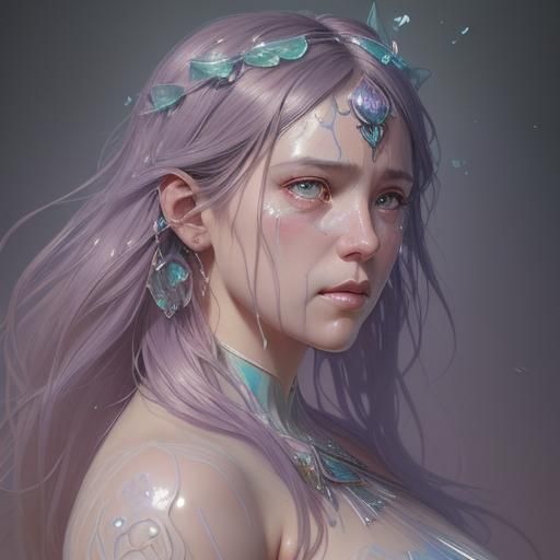 This image shows a head and shoulders portrait of a pastel goddess crying crystal tears. The artwork is rendered in an art nouveau style with dynamic lighting and intricate details.
