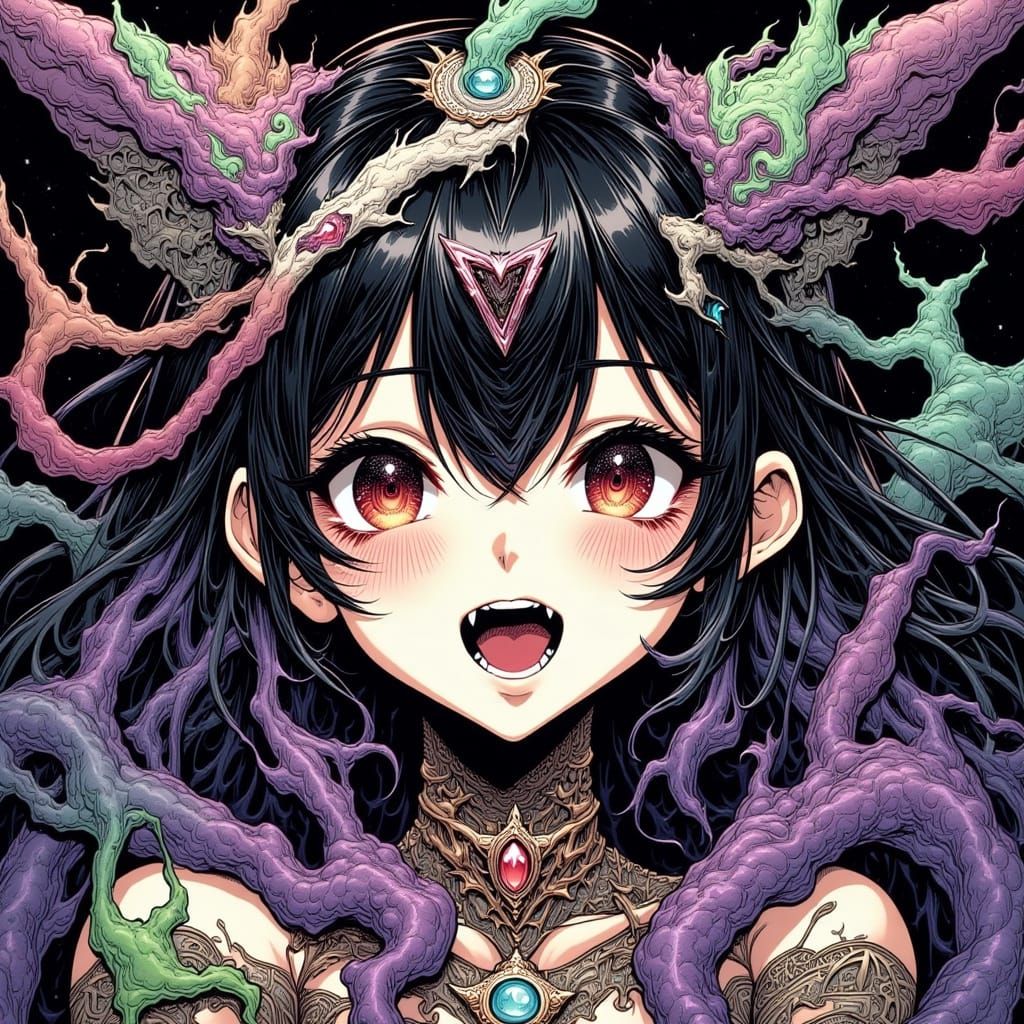 80s anime, crazy yandere stunning adorable space colonist woman, fractured, zentangle, vanta black purple green silver red gold white contra...
