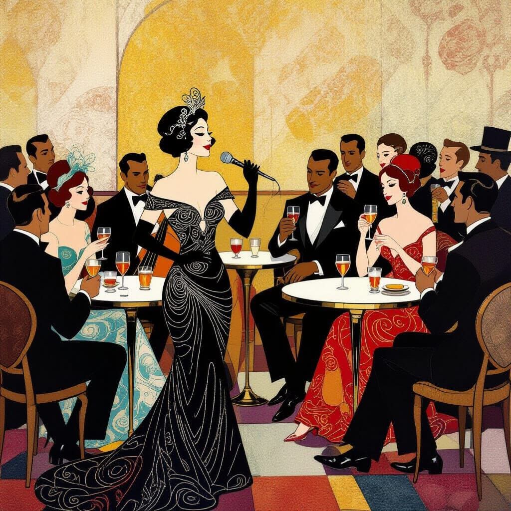 A cross-section illustration of a lively jazz cafe in an art deco style. Patrons in art nouveau attire enjoy music and drinks as a singer performs with her band.