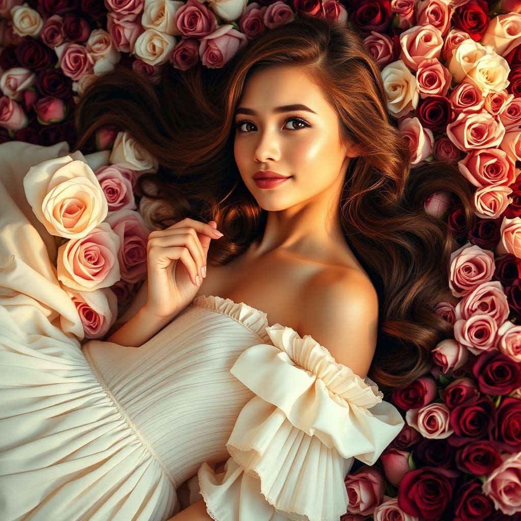 This enchanting image features a serene young woman reclining amidst a lush, multicolored rose bed, her delicate features and smooth skin evoking a sense of romance and opulence, as she gazes into the distance lost in thought, surrounded by the intricate beauty of nature and whimsical, Pre-Raphaelite-ins...