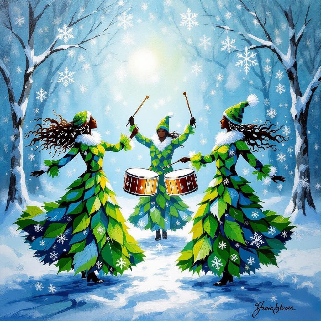This image shows a vibrant airbrush painting of figures composed of leaves and snowflakes dancing to the rhythm of drums. The artwork features a dynamic splash effect.