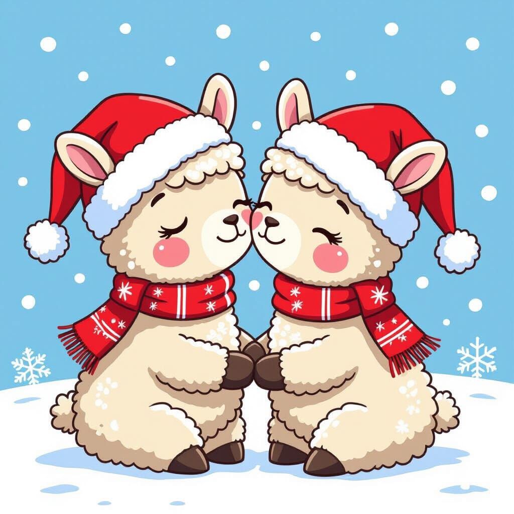This image shows two charming cartoon llamas in festive Santa hats and scarves, sharing a sweet kiss on snowy ground. The artwork features bold lines and vivid colors for a playful, artistic feel.