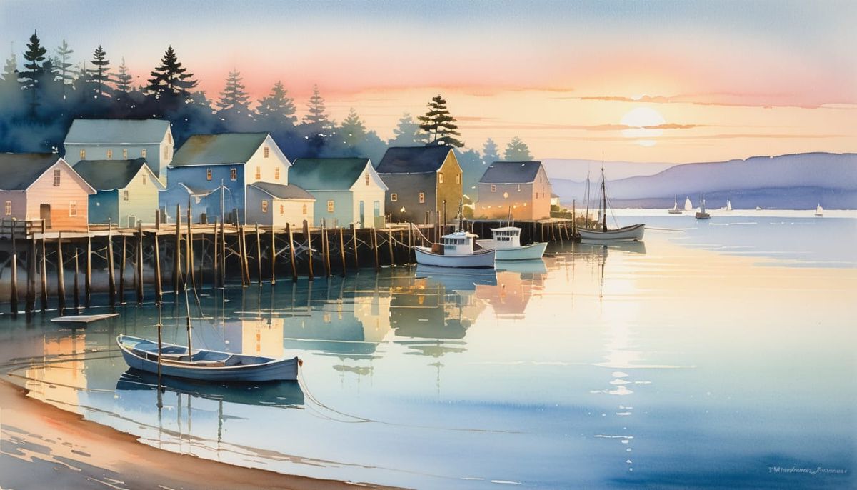 This image shows a peaceful seaside village at dawn, featuring pastel colors, calm water, and fishing boats. Rendered in a delicate watercolor style with soft light.