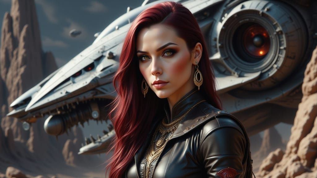 A proud Klingon woman in leather and brass stands before a starship, captured in a cinematic film still. Features dynamic lighting and a cosmic illustration style.