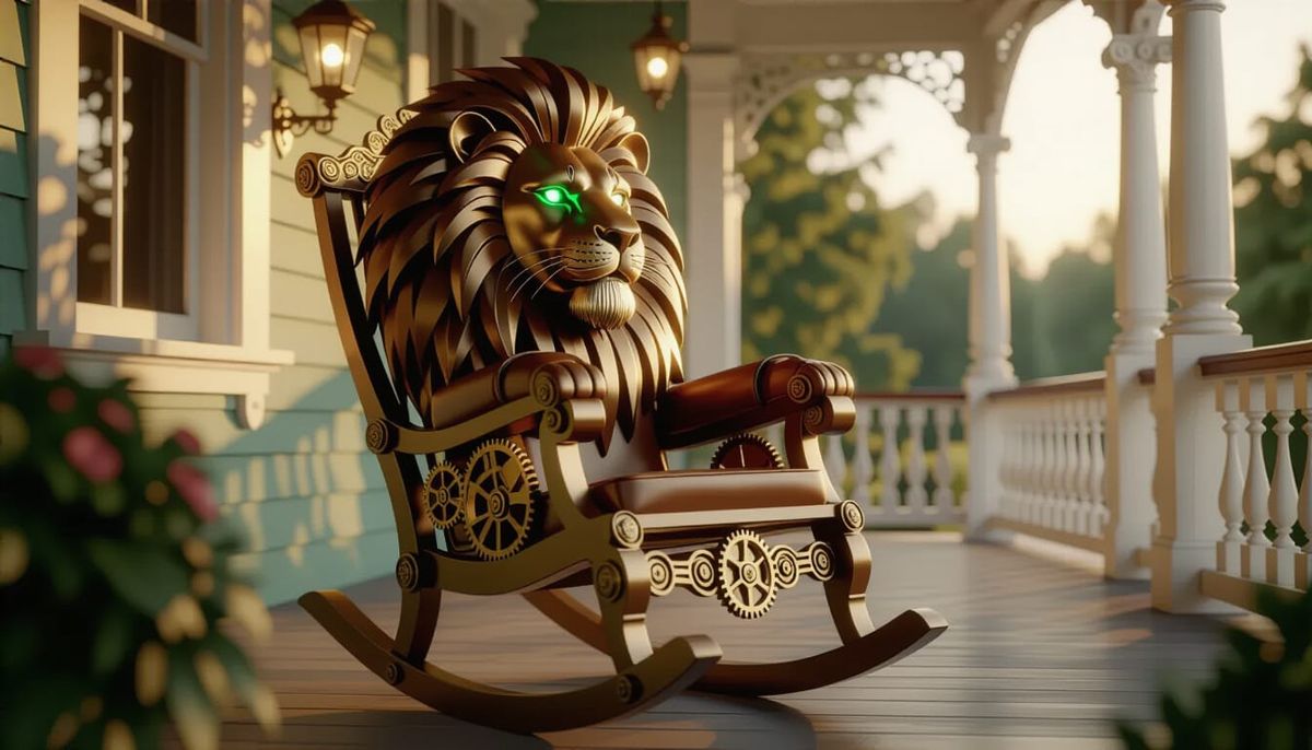This image shows a lion-shaped rocking chair in steampunk style. The chair features gears and crystals, set on a Victorian mansion porch, as a detailed matte painting.