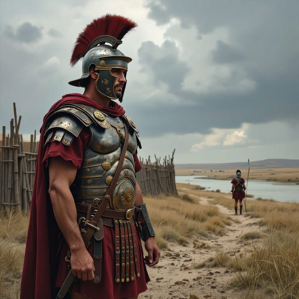 This image shows a Roman legionary guarding the plains near the Tigris River. The soldier's weathered leather armor and hardened face are emphasized with hyperrealistic textures and fantasy elements.