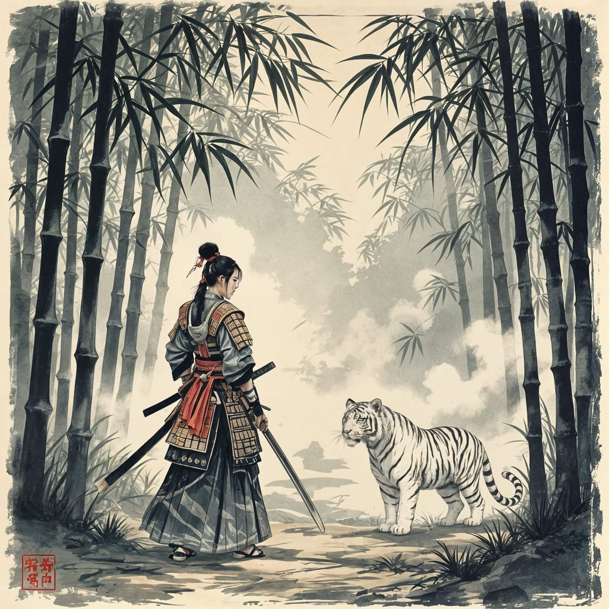 This image depicts a stoic female samurai and her white tiger guarding a misty bamboo grove entrance, created in a vintage Japanese woodblock print style.