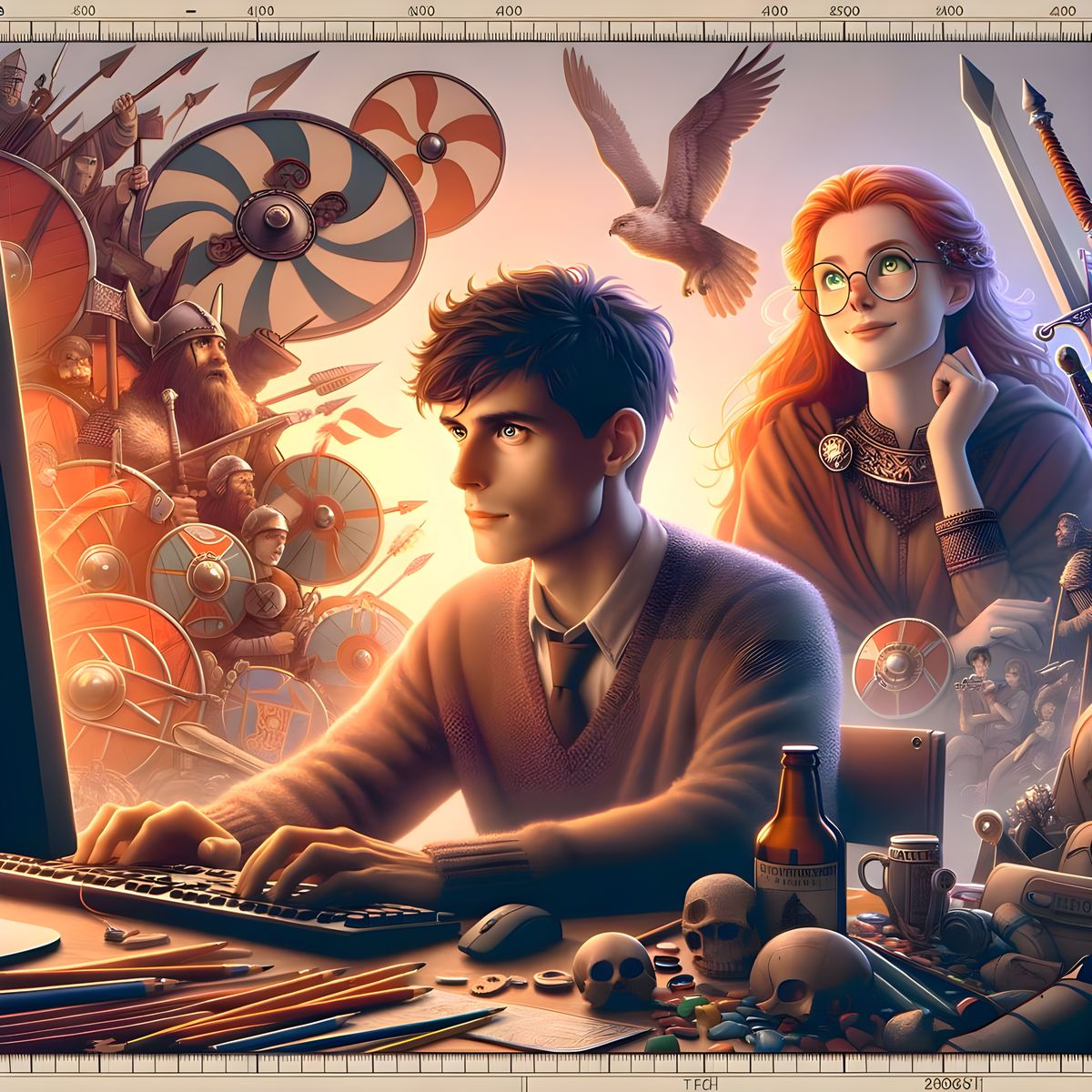 A cinematic still depicting a dark-haired man at a computer, surrounded by Viking and Slavic artifacts. A smiling redhead in glasses stands behind him. The image features pastel tones, film grain, and dramatic lighting.