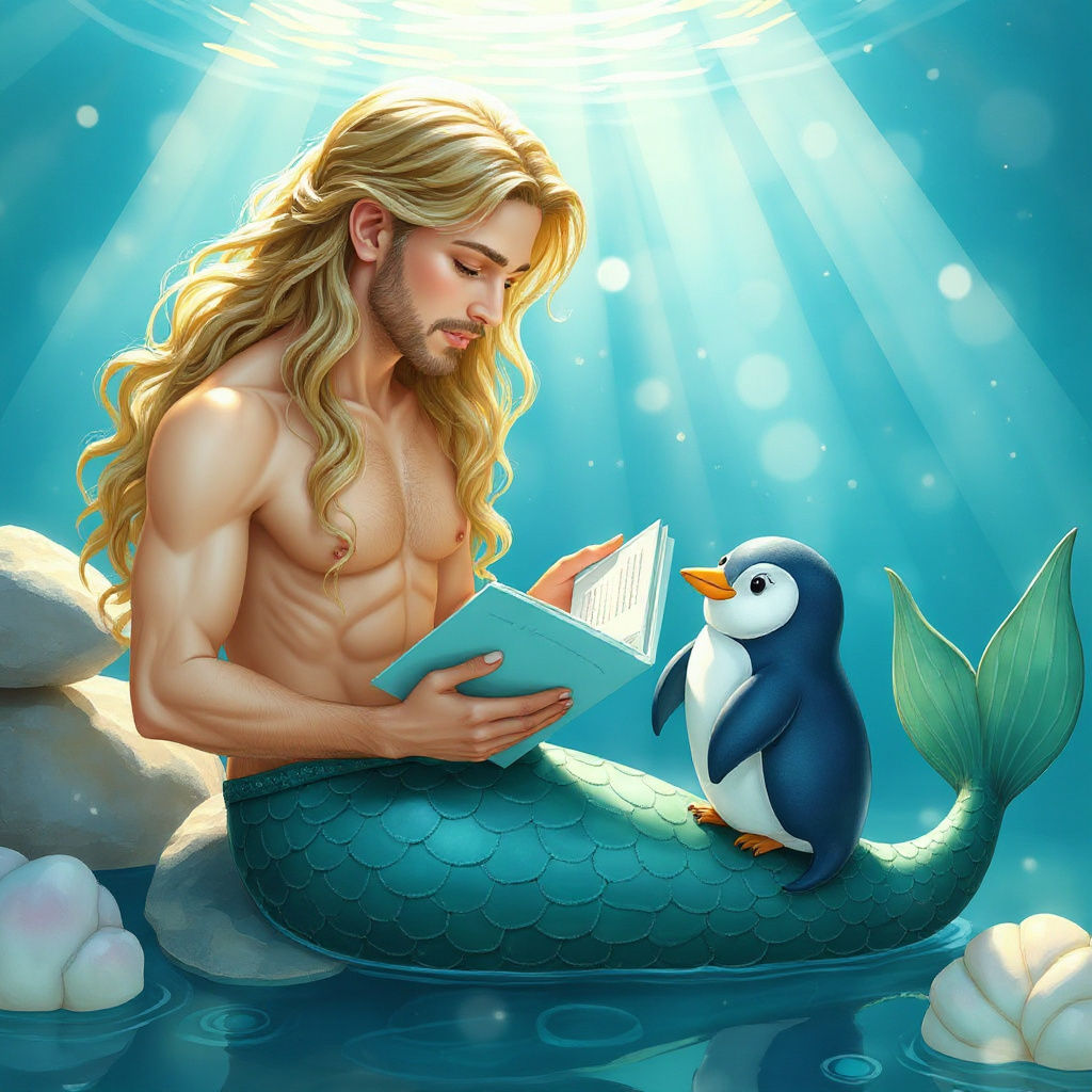 Close-up shot. A merman adorned in pearl jewelry reads a bedtime story to a baby mermaid with stuffed penguin snuggled in a seashell. Sunlight streams through the water, creating dappled patterns of light and shadow. Watercolor on white background, whimsical, pastel colors, soft lighting, detailed, intricate, ...