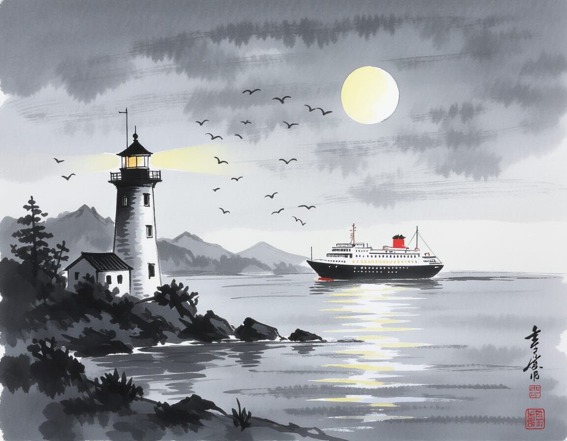 A traditional Chinese ink painting of a summer night seascape, featuring a lighthouse and cruise ship under a crescent moon. The artwork captures tranquility with delicate brushstrokes.