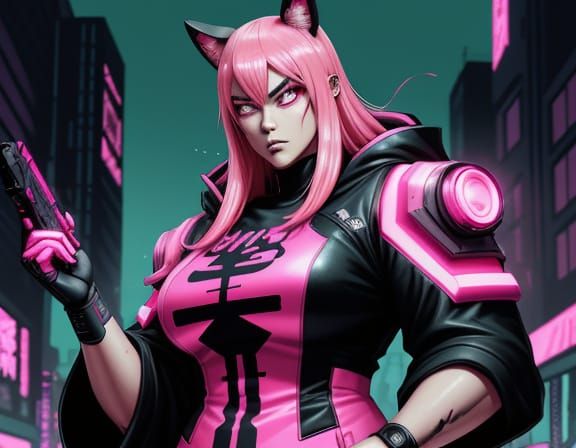 This image shows a plus-sized zombie acolyte in pink clothing by a forest. The character is rendered in a cyberpunk manga aesthetic with neon lighting, metallic textures and bold lines.