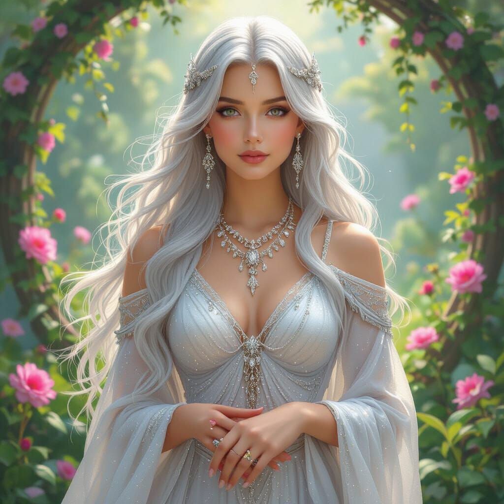 This image shows a goddess in a celestial garden. She has long silver hair and wears stardust-shimmering gown. The artwork blends art nouveau with hyperrealism, creating a cosmic surreal aesthetic.