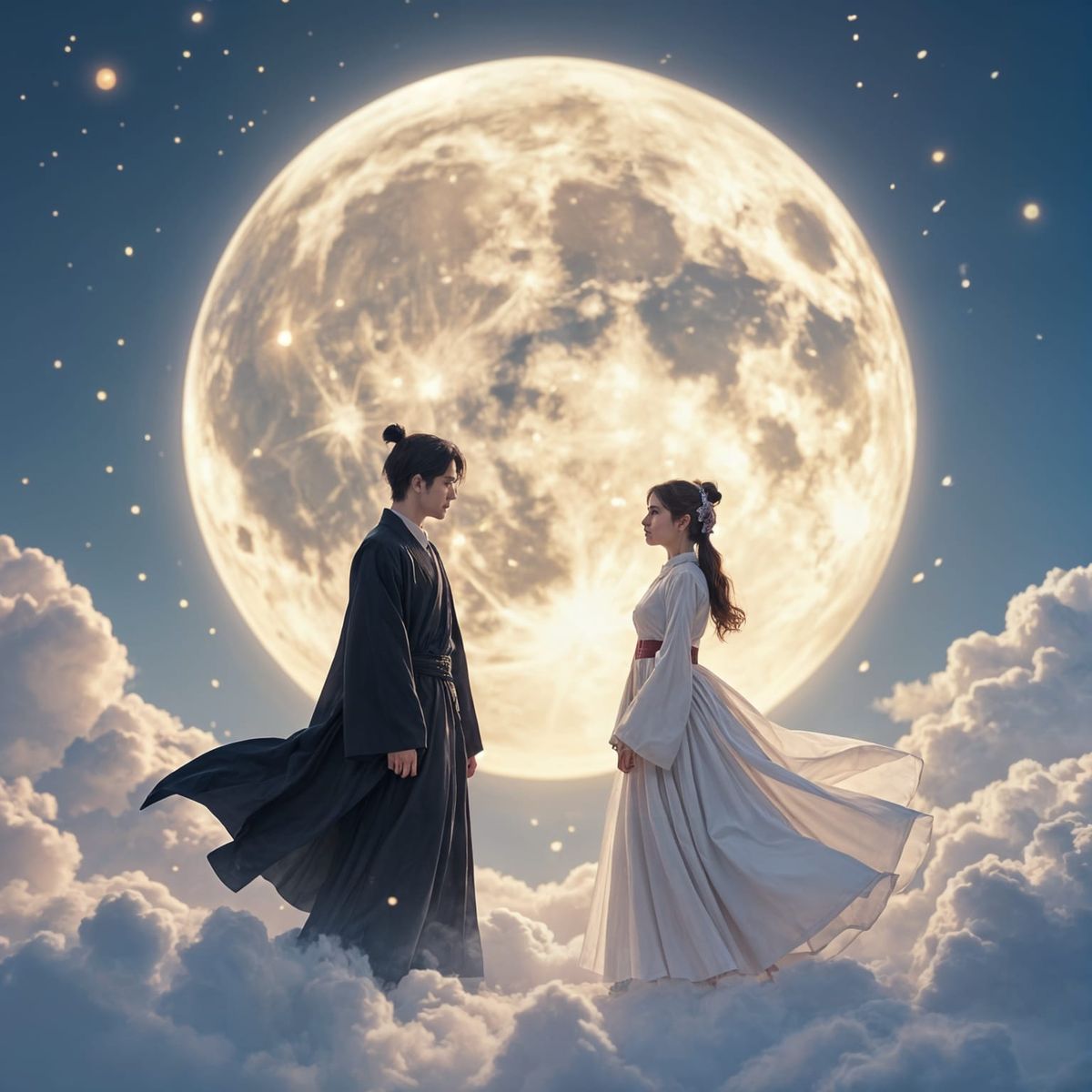 This image shows a couple, a man in black and a woman in white, standing near a giant, detailed moon. The scene evokes Korean fantasy with magical realism and soft lighting.