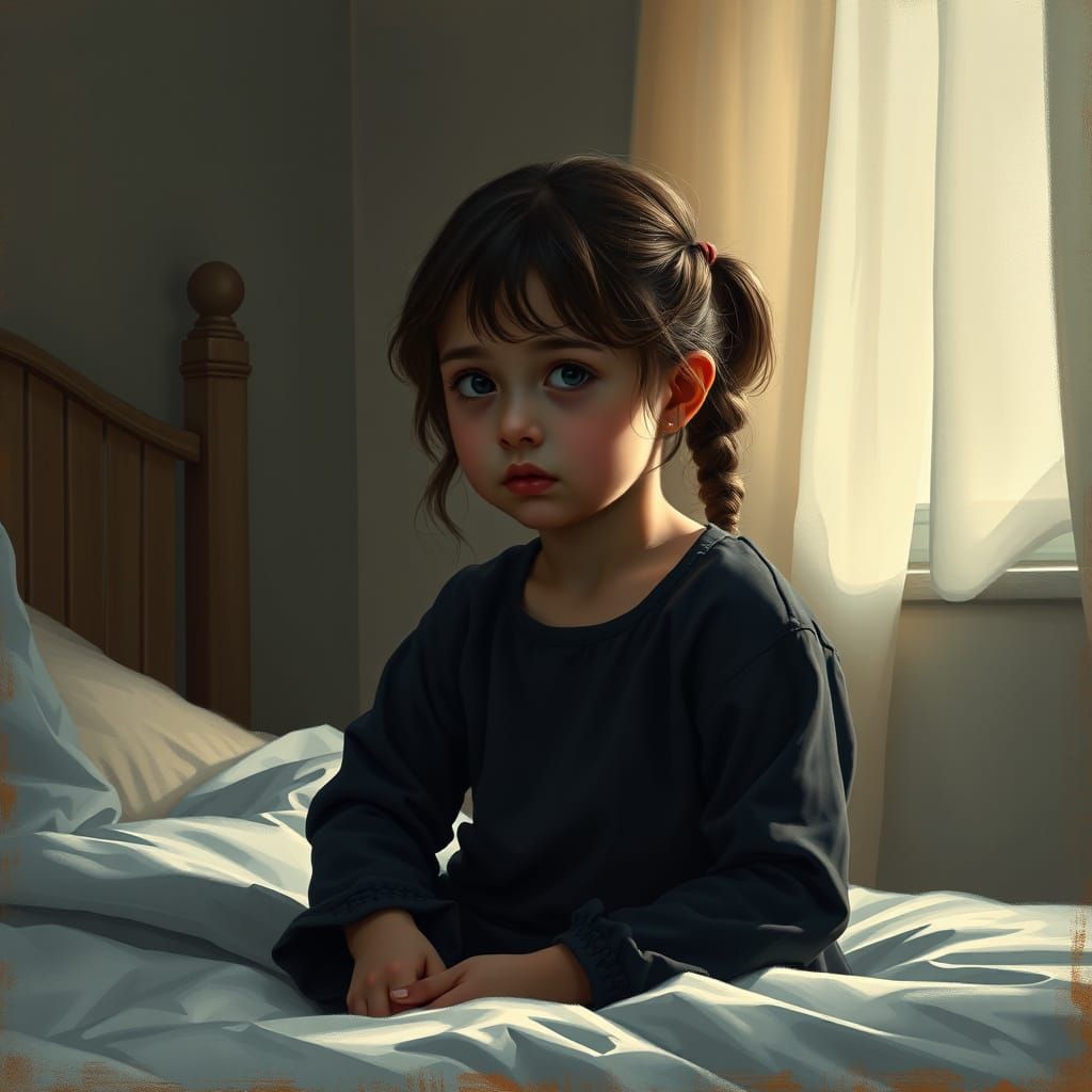 This artwork depicts a young girl, Amara, sitting alone in her bedroom with a sad expression. Soft lighting enhances the melancholic and intimate mood, presented in an evocative, painterly style.