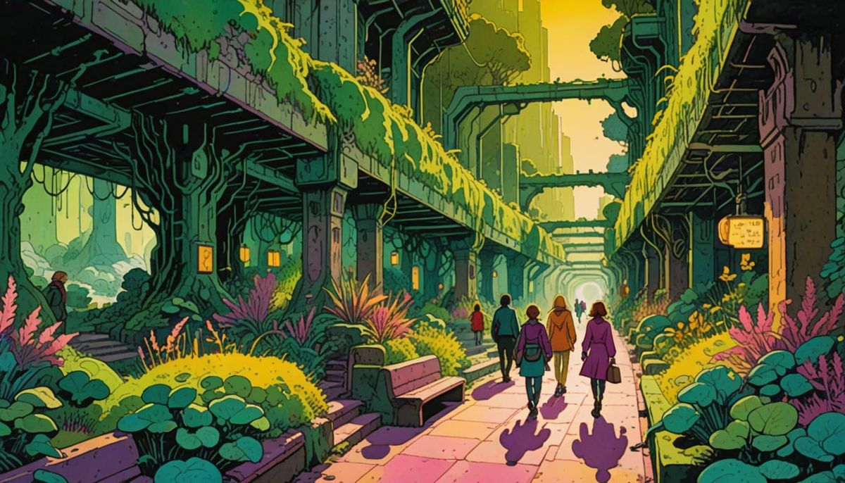 This image shows people walking through a vast underground city filled with plants and benches. The artwork is in a vibrant comic book style, reminiscent of Moebius and Ghibli, with watercolor and gouache textures.