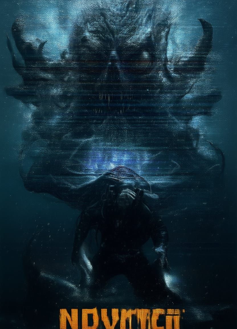 This hyperphotorealistic image depicts a scuba diver's final moments, gripped by a horrifying sea monster in the deep ocean. Captured in a glitchy found footage style, it evokes intense thalassophobia and dread.