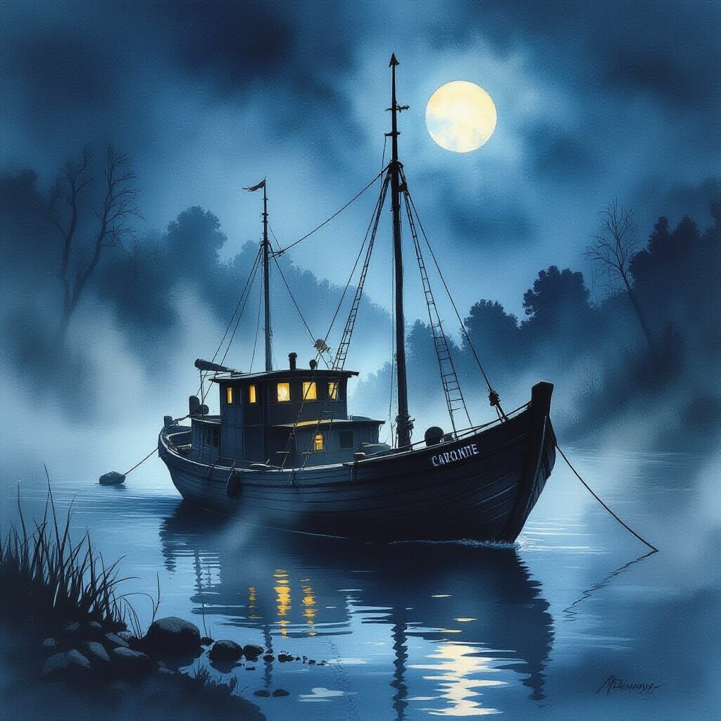 This watercolor painting depicts a large wooden boat navigating a dark, misty river under a moonlit night sky, evoking a sense of mystery.