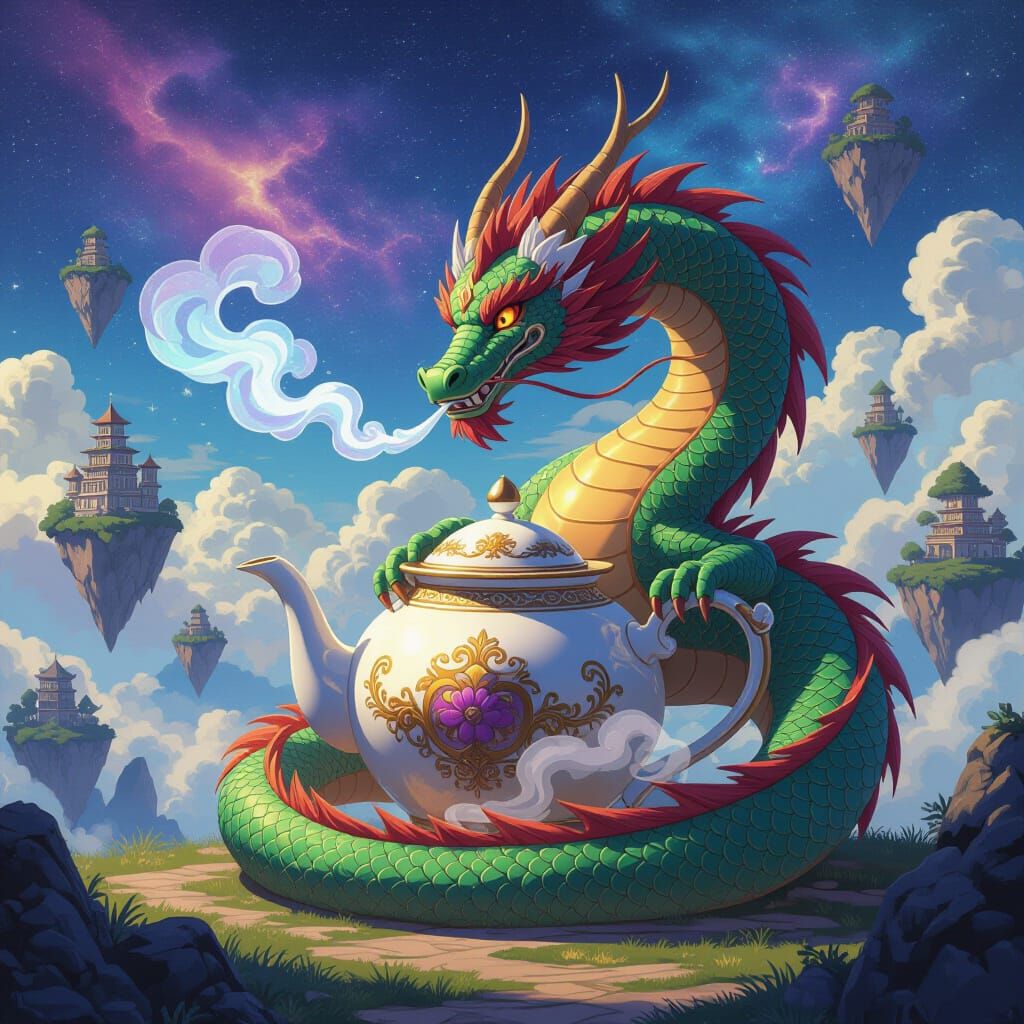 A vibrant, detailed illustration of a shimmering dragon guarding a giant teapot amidst a cosmic landscape. Features intricate fantasy and psychedelic art styles with a painterly texture.