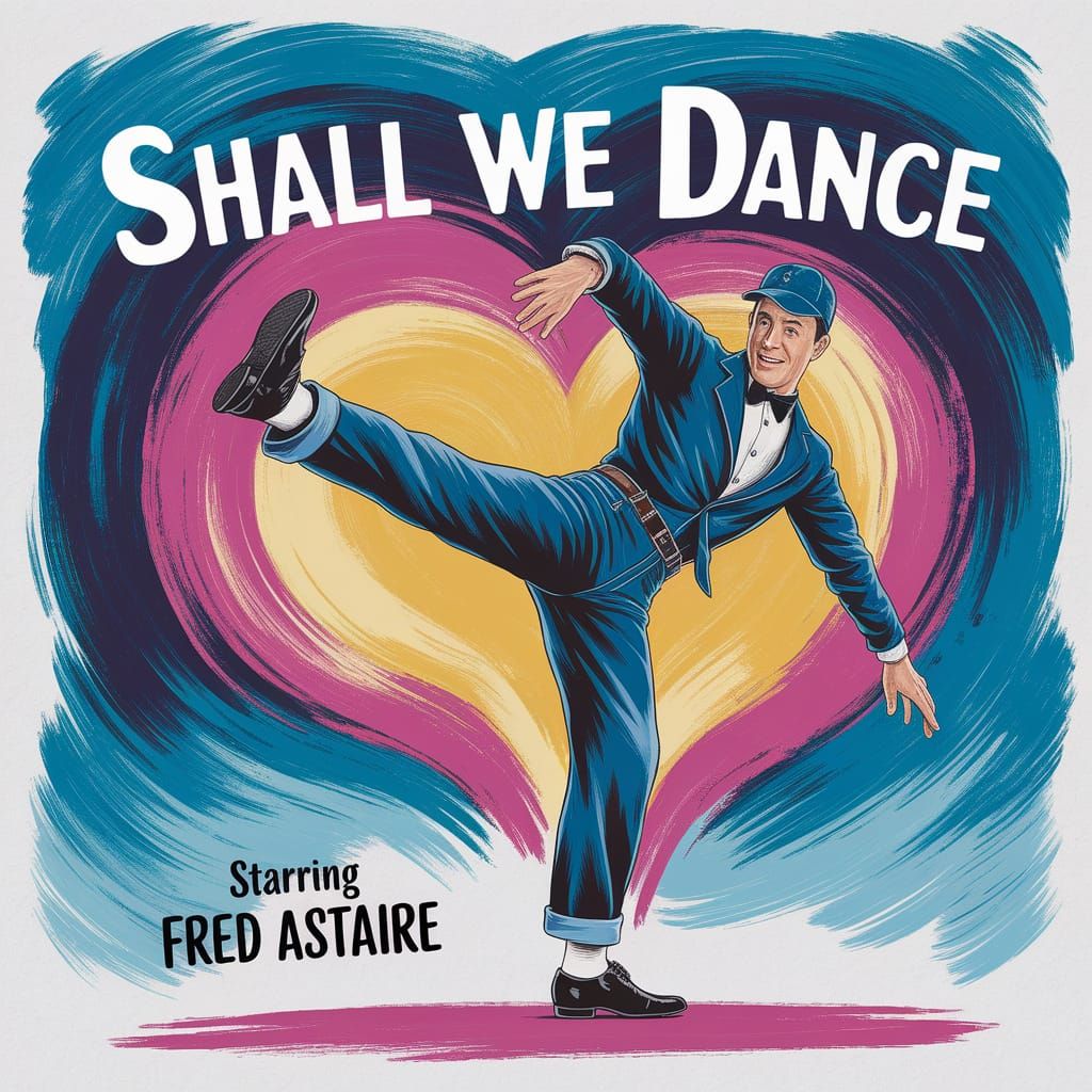 A movie poster for 'Shall We Dance' features Fred Astaire breakdancing in jeans and a cap. The artwork is rendered in vivid acrylic paints with thick, textured brush strokes.