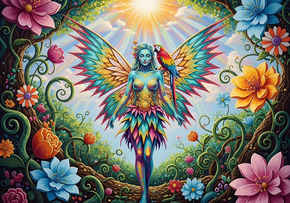 This acrylic oil painting showcases a fairy with iridescent skin and shimmering wings in a lush forest. A colorful parrot rests on her shoulder, surrounded by oversized flowers and dynamic sunlight.