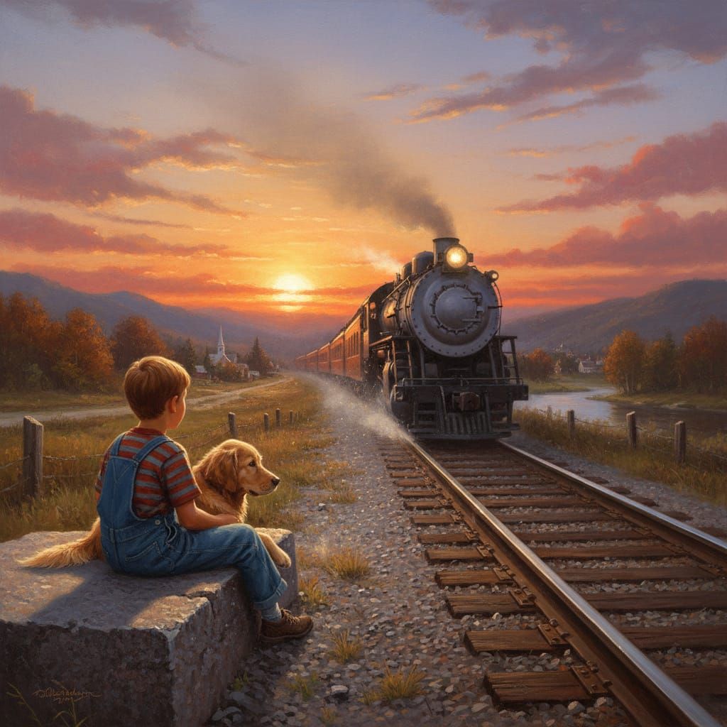 A boy and his dog sit on a large stone by train tracks, watching an approaching train during a vibrant sunset. The scene is rendered in a nostalgic, painterly style with dramatic lighting.