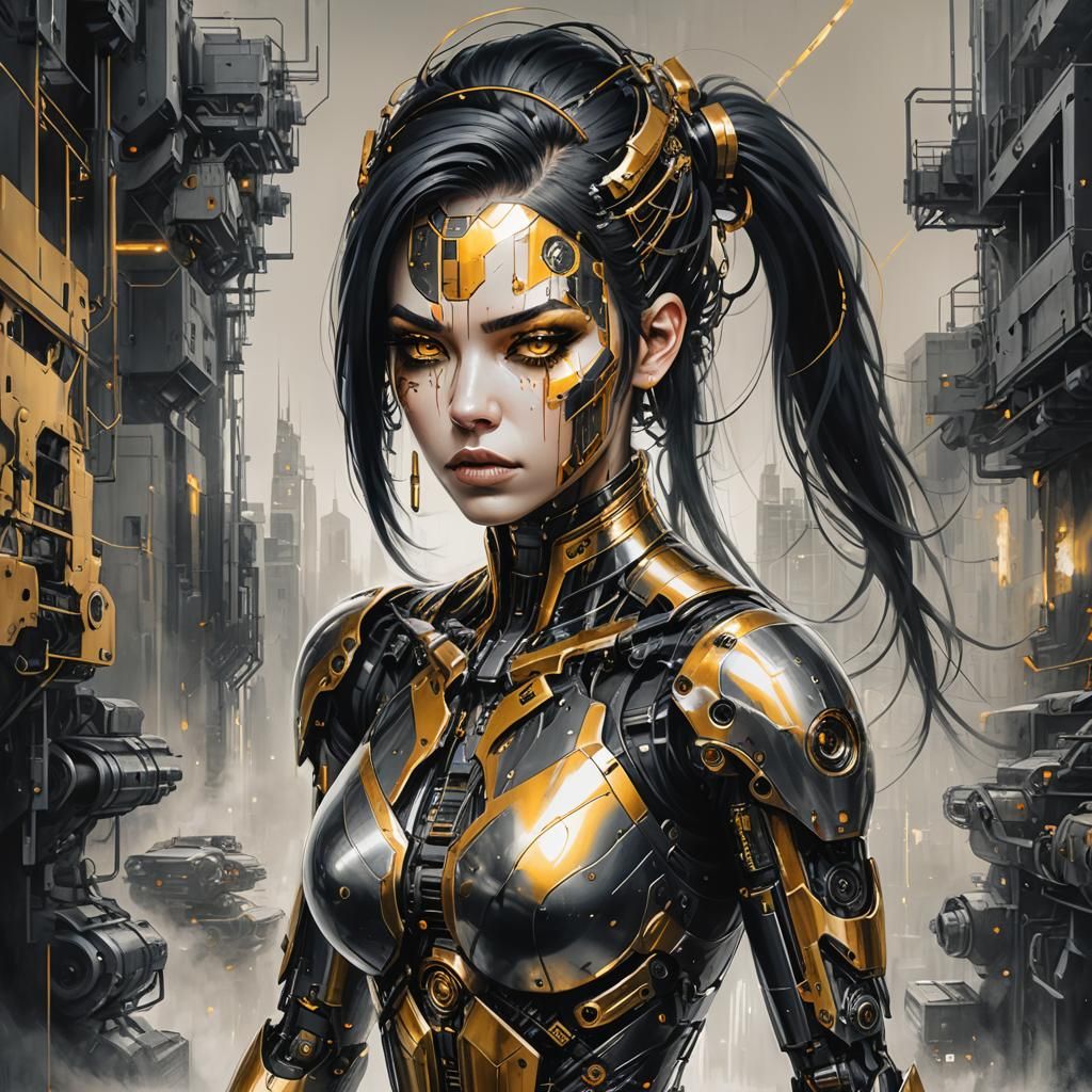 This image shows a full-body portrait of an aggressive cyborg girl with black and gold hair and eyes. The background features a double exposure of an ultra-modern factory in a dreamcore aesthetic.