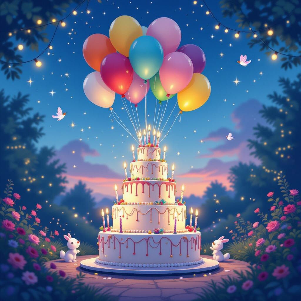 A digital illustration of a magical birthday celebration at twilight. The image features colorful balloons floating above a multi-tiered cake, set within a serene garden filled with fairy lights.