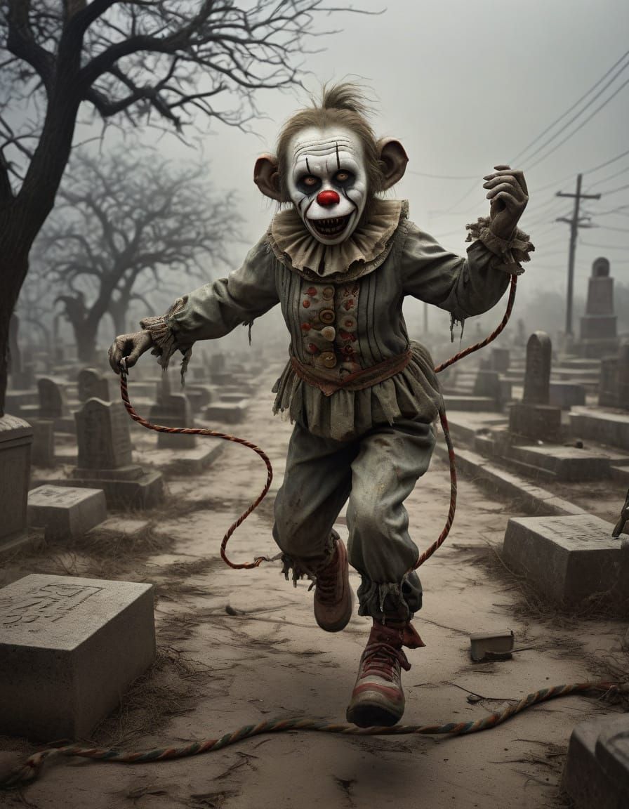 A haunting image of a young girl jumping rope in a desolate, abandoned cemetery, surrounded by the eerie atmosphere of a zombie apocalypse, with intricate details and a cinematic feel