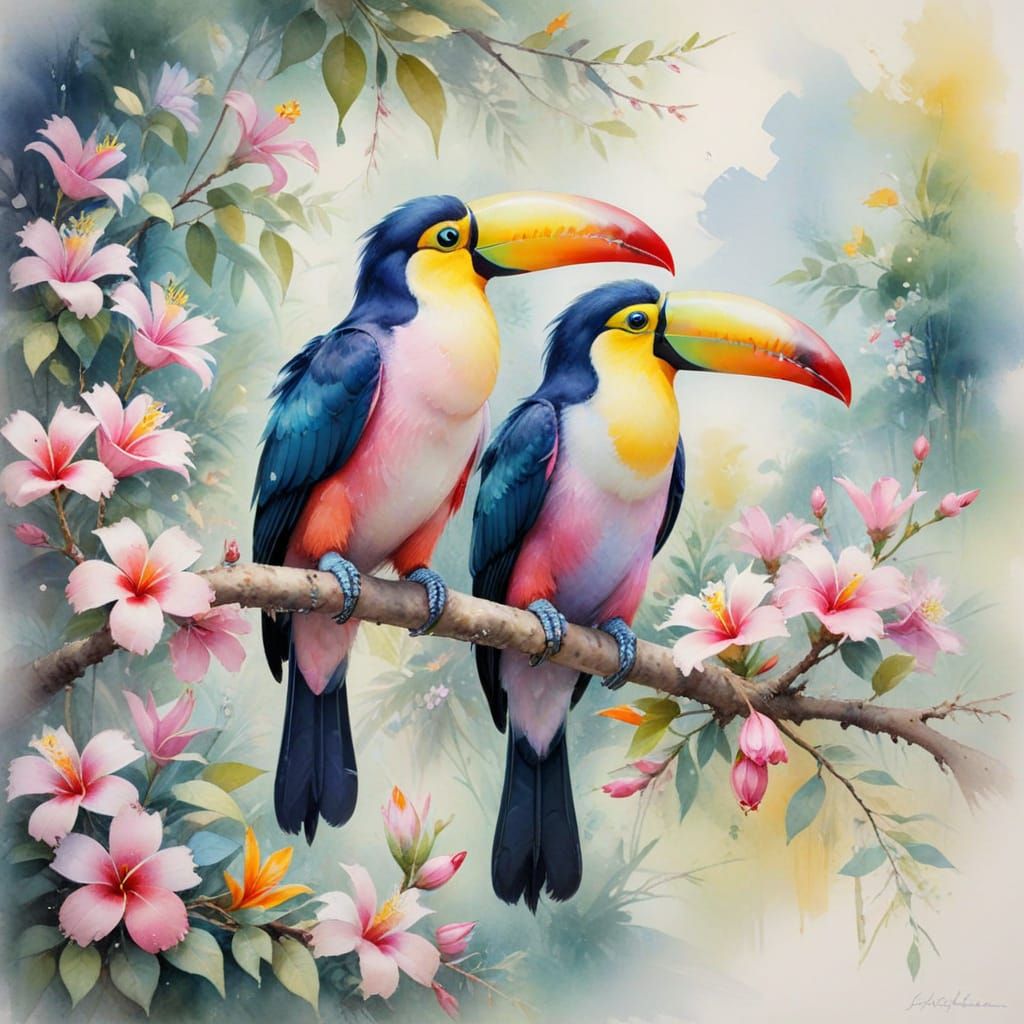 A vibrant painting of toucans resting on a branch. The artwork evokes impressionistic watercolor techniques and ethereal stylization, creating a balance of chaos and beauty.