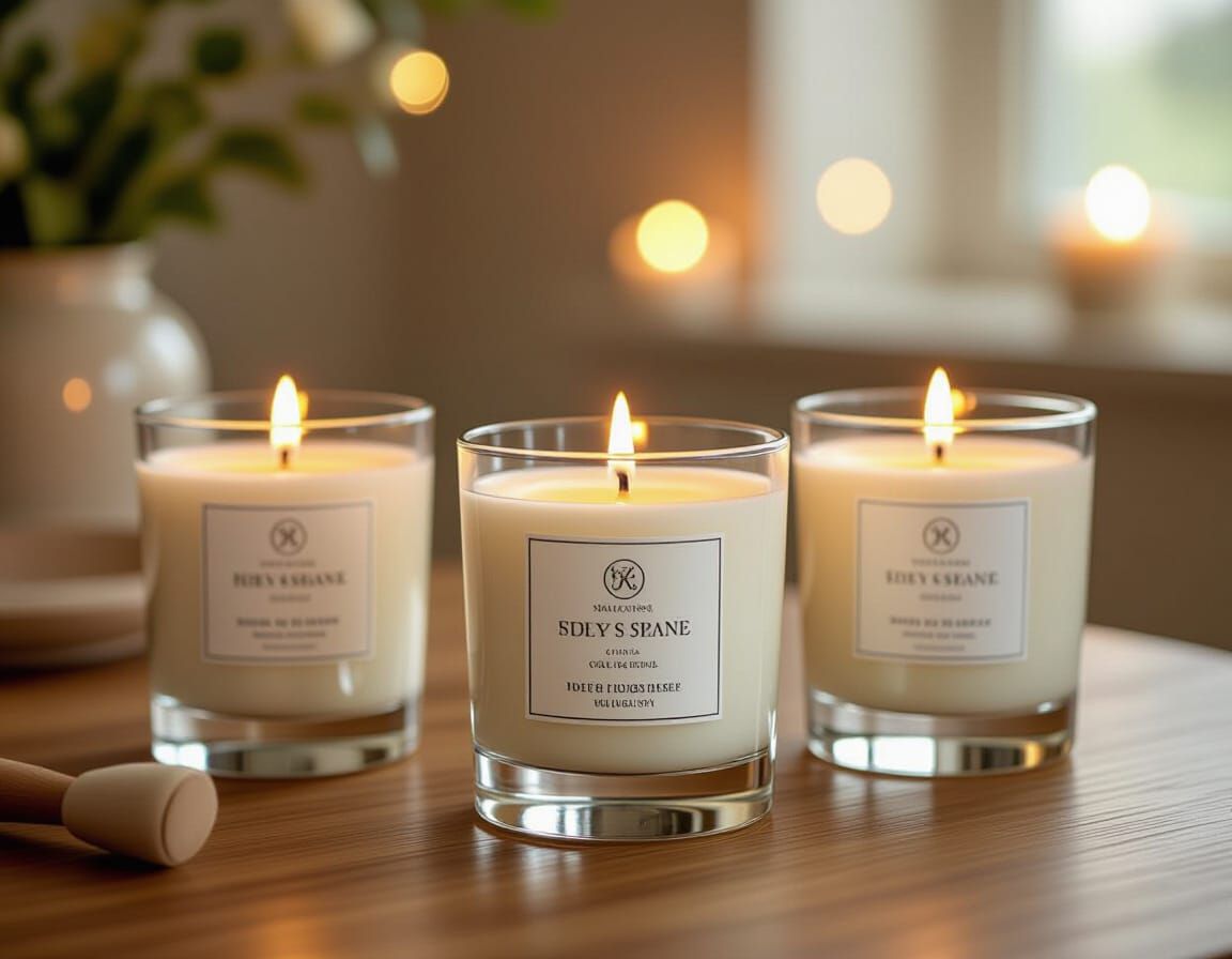 This image shows luxury scented candles in elegant glass jars displayed on a wooden surface. Soft, warm lighting and a blurred background create a realistic and inviting aesthetic.
