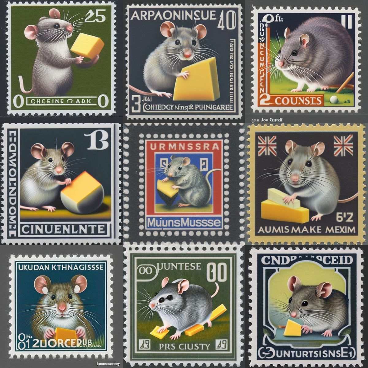 This image shows a UK postage stamp featuring a cute grey mouse with cheese. The artwork is reminiscent of traditional oil paintings.