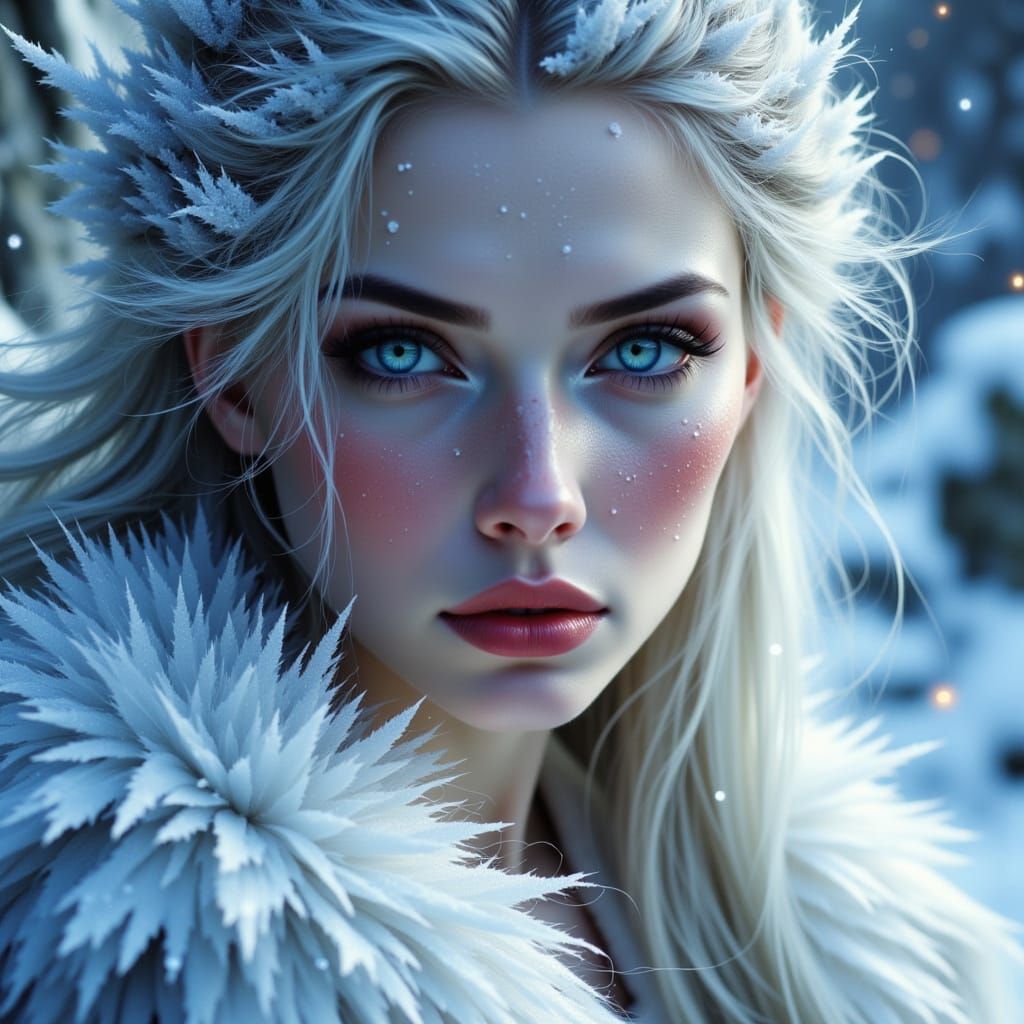 A close-up digital painting of a stern snow queen with icy hair and a fur-trimmed gown, set against a snowy winter wonderland. Features detailed, ethereal, and cool-toned lighting.