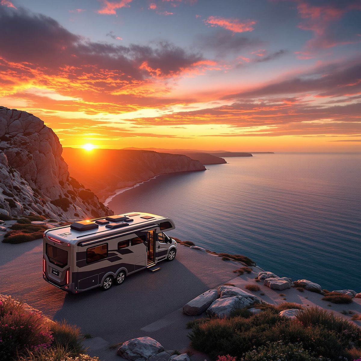 A photorealistic image of a modern motorhome parked on a cliff at sunset. Golden hour light illuminates the vehicle and a vibrant, multi-colored sky over a calm ocean.