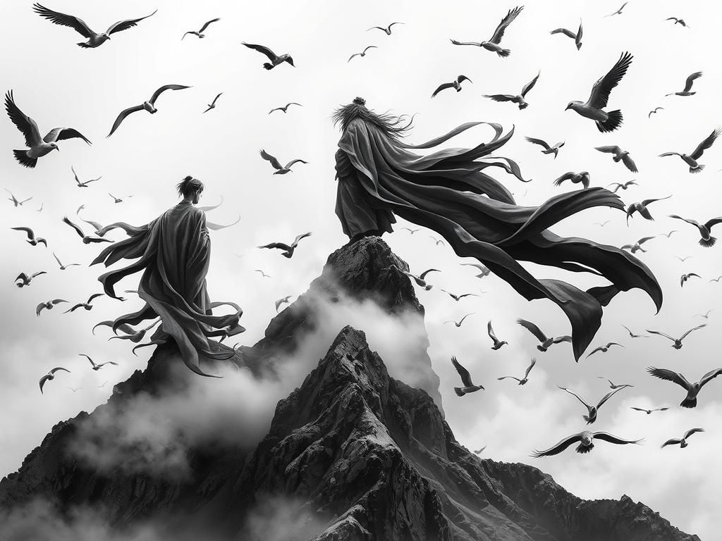 A dramatic monochrome image shows mountain spirits on a misty peak. Birds circle them in a vortex. The image uses high contrast and intricate linework to create an ethereal atmosphere.