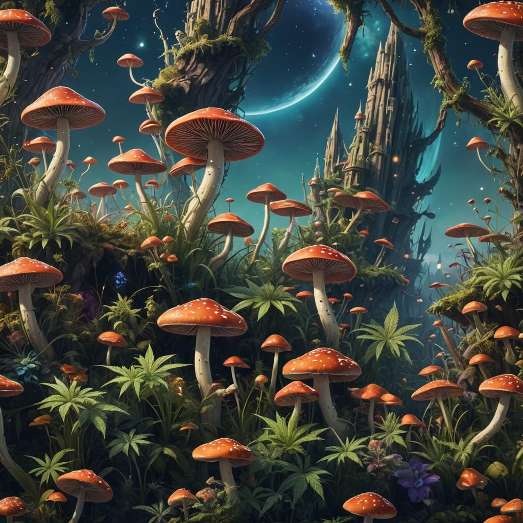A vibrant, detailed matte painting depicting a surreal scene with cannabis, mushrooms, and space elements. The artwork features deep colors and intricate details in a fantastical concept.