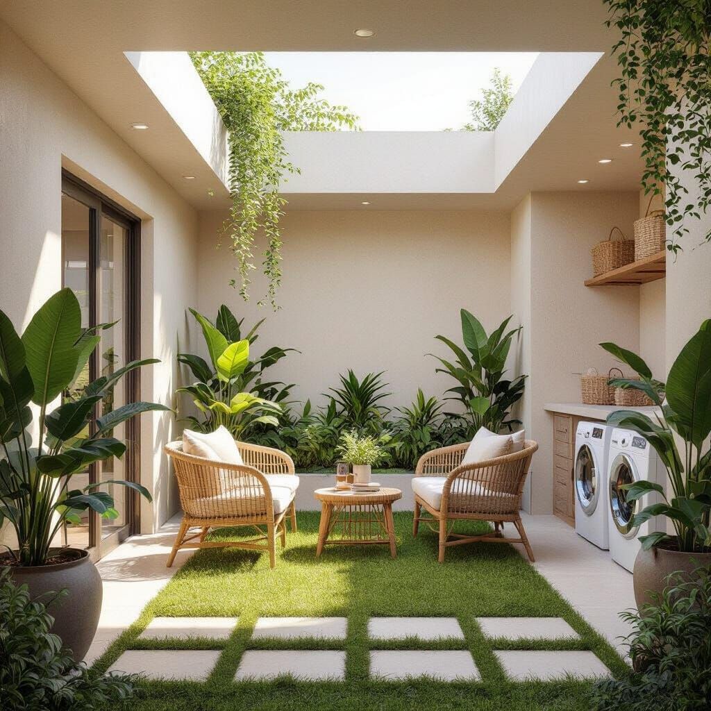 This 3D render showcases a hyperrealistic interior courtyard with natural, simple design. It features synthetic grass, shade-loving plants, rattan furniture, and a rustic laundry area, bathed in soft midday light.
