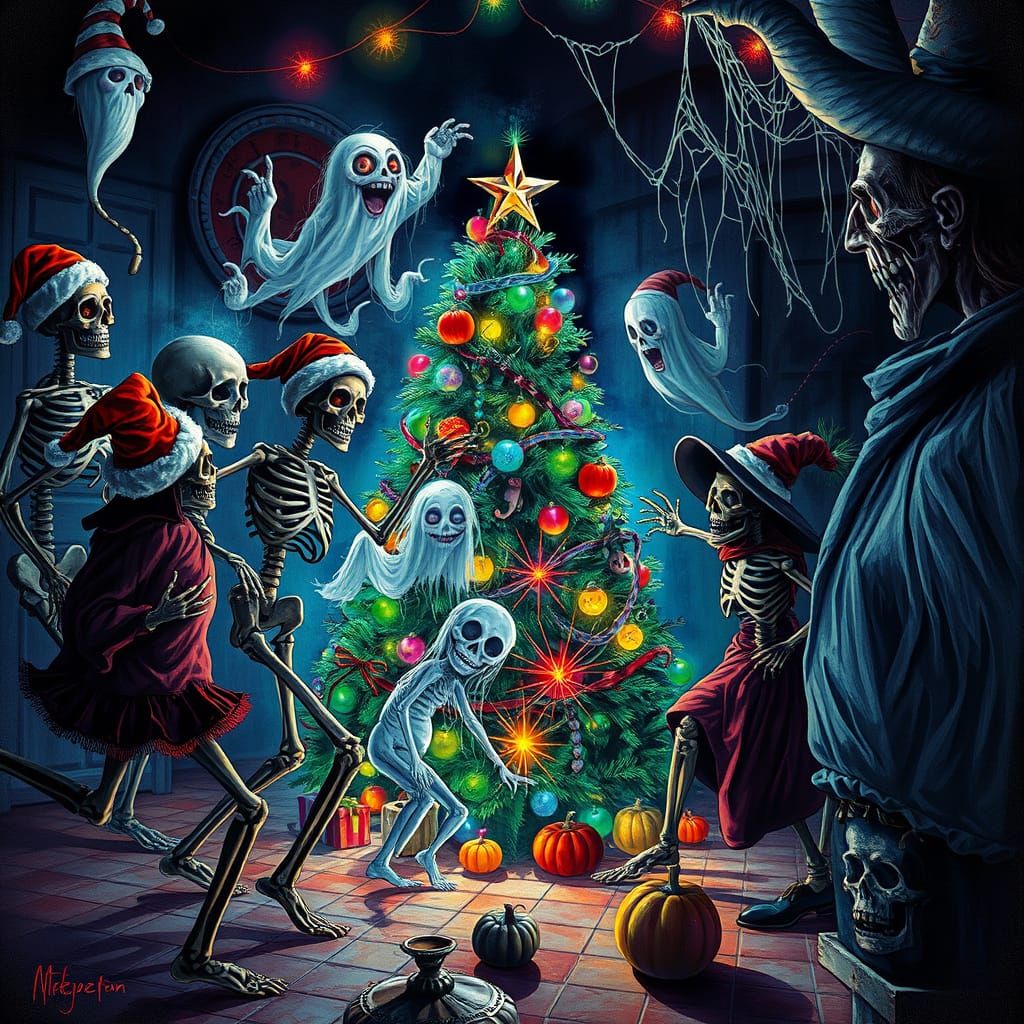A vibrant, illustrative scene merging Christmas and Halloween with dancing skeletons, ghouls, and witches around a spooky tree. Dramatic lighting creates an eerie, gothic atmosphere.